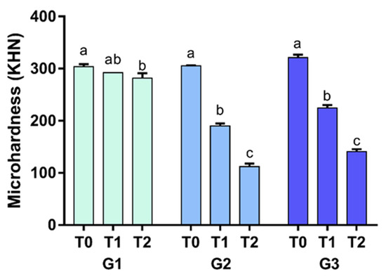 The results demonstrated that there was a statistically significant difference between all treatment times for G2 and G3 (p < 0.0001), while in G1, the greatest loss was observed in the comparison between T0 and T2 (p < 0.05). Figure 3 shows the MH values.