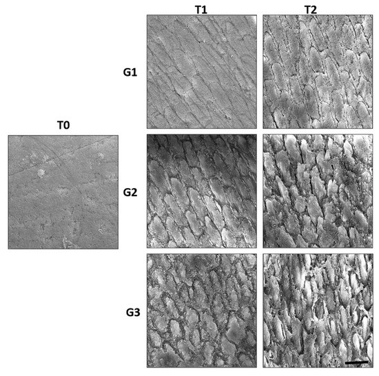 At T0, specimens did not receive any treatment; therefore, it was possible to observe the integrity of the enamel prisms. At T1, some degree of exposure of the enamel prisms, characterizing the loss of aprismatic enamel in the horizontal direction, was observed, which was more evident in G2 and G3. Figure 5 shows the electron micrographs of all treatments.