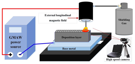 The system of external longitudinal magnetic field hybrid gas metal arc welding additive manufacturing (M-GMAW-AM) is shown in Figure 1. The system mainly included a GMAW power source produced by Kemppi in Lahti, Finland, an external longitudinal magnetic field hybrid GMAW torch produced by Kemppi in Finland, and a high speed camera produced Optronis in Kehl, German. The coil turns of the longitudinal magnetic field are 140, and the magnetic excitation current is arranged from 1 A to 3 A. Under the action of the external longitudinal magnetic field, the metal transfer will be affected by the external electromagnetic force. The high speed camera is carried out to observe the process of short-circuiting transfer. The frame rate of 1000 fps and exposure time of 10 μs are employed at the capture parameters of the high-speed camera.