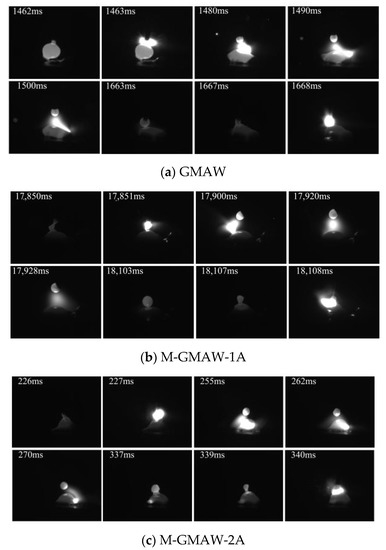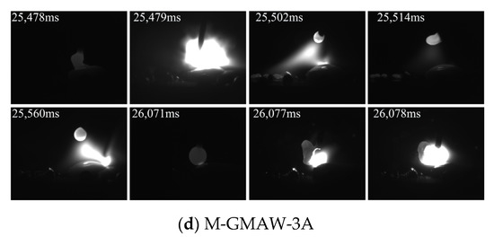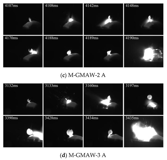 Figure 2 shows the images of short-circuiting transfer, when the wire feeding speed of 2 m/min is used. The typical features of short-circuiting transfer could be obtained in Figure 2. The short-circuiting transfer of GMAW is shown in Figure 2a. The phenomenon of short circuiting is found at 1462 ms and 1663 ms. The size of the droplet (1462 ms) was obviously larger than that of the droplet (1663 ms), which expressed that the stability of the deposition process was poor. At the stable arcing stage (1463 ms~1490 ms), the arc shape was biased to the left. However, when the external longitudinal magnetic field is added, the arc shape obviously rotates as shown in Figure 2b–d. The similar results had been reported that, under the action of axial electromagnetic force, the arc shape expressed periodic rotation [12]. Figure 2b shows the images of short-circuiting transfer in the M-GMAW with a magnetic excitation current of 1 A. The phenomenon of short circuiting is found at 17,850 ms and 18,103 ms, and the droplet size is less than that of Figure 2a. In addition, the droplet sizes at the 17,850 ms and 18,103 ms have a small difference. When the magnetic excitation current is increased to 2A, the droplet sizes also have a small difference. However, with the droplet sizes, an obvious difference is found when the magnetic excitation current of 3 A is used (Figure 2d).