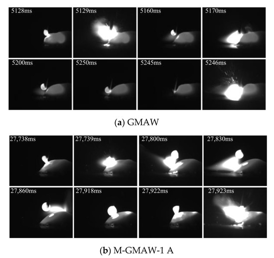 Normally, surface tension can hinder the droplet transfer and keep droplet morphology [14]. During the short-circuiting transfer, when the combined force of gravity and other forces exceed the surface tension, the droplet can transfer to a welding pool. The surface tension can be expressed as Fγ = 2πRγ, the R is the radius of welding wire, and the γ is the surface tension coefficient. In this work, the radius of welding wire and surface tension coefficient is the same owing to the same welding wire during the GMAW and M-MIG. Therefore, the hindering force of droplet transfer is the same in the GMAW and M-MIG. The different gravity and other forces are the main causes of the change of droplet transfer, as shown in Figure 5. It can be found that the short-circuiting transfer cycles in the M-MIG were larger than that of MIG when the same wire feeding speed was employed. Ref. [12] indicated that the charged particles rotated with a higher speed in the M-MIG compared with that of MIG. The motion path of charged particles in the M-MIG was increased compared with that of MIG. The arc had an increased loss of energy of heating and motion. This is meant that, when the welding voltage is constant, the resistance of the arc increases, and the welding current and arc temperature decrease. Therefore, short-circuiting transfer cycles in the M-MIG were less than that of the MIG.