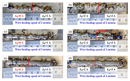 Figure 6 shows the images of surface morphology of the deposition layer with the different short-circuiting transfers. The IM expresses the magnetic excitation current. Figure 6a,b shows the surface morphology of the deposition layer with the wire feeding speed of 2 m/min. The deposition layers with different processes can not be forming, which consists of the discontinuous deposition layer. It can be concluded that the non-forming of deposition layer may be affected by the instability of droplet transfer (Figure 2). The discontinuous flow of molten metal was the direct reason for the discontinuous deposition layer. When the wire feeding speed is increased to 3 m/min, the forming of the deposition layer obviously changed as shown in Figure 6c,d; however, there are some spatters on the surface of deposition layer due to the change of droplet transfer path caused by a magnetic field. In addition, when the magnetic excitation current is increased to above 2A, the forming of the deposition layer is poor. This is because a larger electromagnetic force obtained by an electromagnet could adversely affect the droplet transfer, such as a great change of arc shape and spatter. When the wire feeding speed of 4 m/min is used, the uniform forming of the deposition layer is obtained as shown in Figure 6e,f. From Figure 4, it also can be found that the stable droplet transfer was obtained with the wire feeding speed of 4 m/min. Therefore, the stable droplet transfer was the key to getting the uniform forming of the deposition layer.