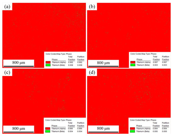 Figure 8 shows the images of phase distribution of the cross-section of the deposition layer obtained by using wire feeding speed of 4 m/min. α phase is shown in red and β phase is shown in green. Figure 8a shows the phase distribution of the cross-section of the deposition layer in the MIG. The content of the α phase is 0.992, and the content of β phase is 0.008. Figure 8b shows the phase distribution of the cross-section of the deposition layer in the M-MIG with the magnetic excitation current of 1A. The content of α phase is 0.997, and the content of β phase is 0.003. When the magnetic excitation current is increased to 2A, the content of the α phase is 0.995, and the content of β phase is 0.005, as shown in Figure 8c. When the magnetic excitation current of 3A is used, the content of α phase is 0.995, and the content of β phase is 0.005, as shown in Figure 8d. Therefore, it could be concluded that the influence of the magnetic field on phase content was not obvious and had no regularity.