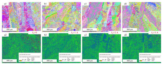 Grain morphology and misorientation of cross-section of the deposition layer obtained by using wire feeding speed of 4 m/min. (Note: (a1,a2) MIG, (b1,b2) M-MIG with magnetic excitation current of 1A, (c1,c2) M-MIG with magnetic excitation current of 2A, (d1,d2) M-MIG with magnetic excitation current of 3A, the number 1 and 2 are expressed respectively the grain morphology and misorientation).