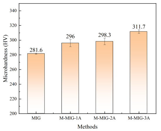 Figure 10 shows the average microhardness of the deposition layer obtained by using wire feeding speed of 4 m/min with different methods. The average microhardness of the deposition layer obtained by using MIG is 281.6HV. When the M-MIG with the magnetic excitation current of 1A is used, the average microhardness of the deposition layer is about 296 HV. When the M-MIG with the magnetic excitation current of 2 A and 3 A are used, the average microhardness of deposition layer is about 298.3 HV and 311.7 HV. It could be found that the average microhardness of M-MIG deposition layer was greater than that of the MIG, and the average microhardness of M-MIG deposition layer was increased with the increase of the magnetic excitation current. The causes for the change in microhardness could be summed up in two ways: first, the β grain was refined by using the magnetic field. According to the Hall–Petch formula, the microhardness was increased with the reduction of grain size [18]. In this work, the grain size in the M-MIG was obviously less than that of the MIG. Refinement grain was good for improving the microhardness. In addition, the martensite α could also determine the change tendency of microhardness. The microhardness was increased with the amount of acicular martensite α’ [10].