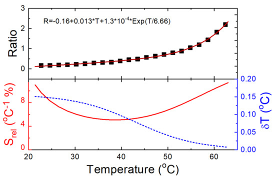 - Ćirić, A.; Marciniak, Ł.; Dramićanin, M.D. Luminescence intensity ratio squared—A new luminescence thermometry method for enhanced sensitivity. J. Appl. Phys. 2022, 131, 114501. [Google Scholar] [CrossRef]