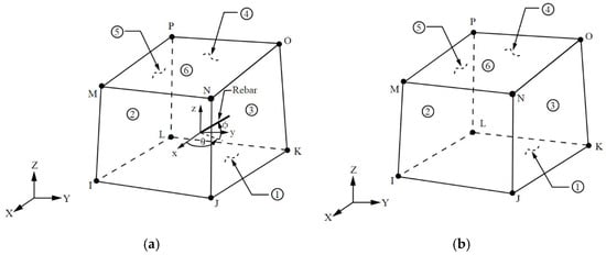 SOLID65 was used to model concrete. The element was defined by eight nodes having three degrees of freedom at each node: translations were in the nodal x, y, and z directions. The solid was capable of cracking in tension and crushing in compression. A 3-D element (LINK180) was used to model the reinforcement. The element was a uniaxial tension–compression element with three degrees of freedom at each node: translations were in the nodal x, y, and z directions. Tension-only (cable) and compression-only (gap) options were supported. A 3-D solid element (SOLID185) was used to model the steel plates for loading and support. Figure 1 illustrates the types of elements.