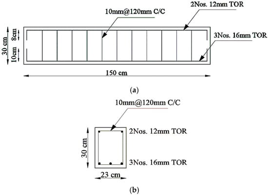 The aim of this section is to verify the validity of our simulation on ANSYS, and not to repeat the previous work. Therefore, after the verification, we could build an analytical study based on our own parameters. Two reinforced concrete beams from previous experimental work by Milan Joy et al. [] were chosen to verify our ANSYS results. The research aimed to find the effect of bacterial concrete with fly ash on the strength characteristics of concrete. The beam’s dimensions were 230 × 300 × 1500 mm and it was reinforced by three bars of a 16 mm diameter as the main reinforcement at the bottom and two bars that were 12 mm in diameter at the top. The stirrups were two-legged and 10 mm diameter @ 120 mm. The concrete dimensions and reinforcement details are shown in Figure 2.