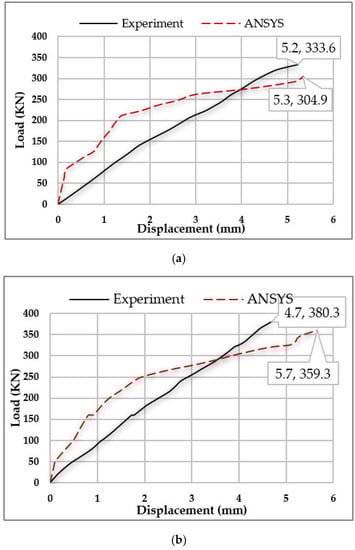The numerical curve showed the nonlinearity of the concrete material as it is defined on ANSYS, therefore it took the shape of a parabola, showing a small gap in the elastic zone between both curves. Figure 5 shows the load-displacement curves and Table 4 illustrates the failure loads and the corresponding displacements.