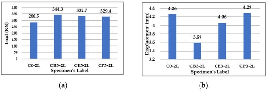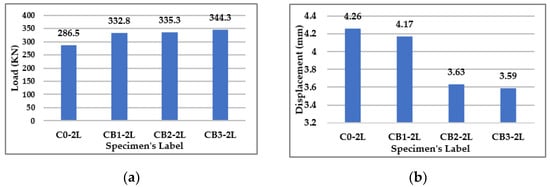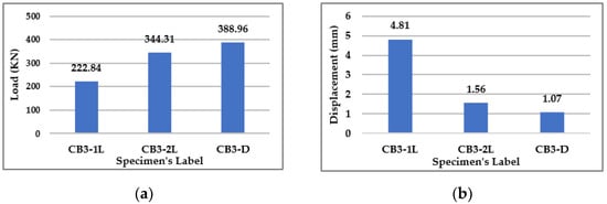 As shown in the previous parameter, a percentage of 3% is more effective for enhancing the beam’s behavior. Therefore, in the current section, three types of bacteria were investigated (Bacillus subtilis, E. coli, and Pseudomonas sps.) at the same concentration of 3%. The following bar chart in Figure 8a illustrates the failure loads.