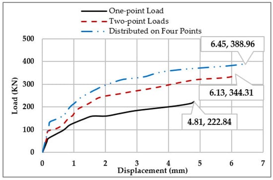 Figure 9b shows that distributing loads on more points can decrease the deflection of the beams, as the deflection of the beam with a distributed load on four points decreases by 77.8% when it is compared to the deflection of the beam with a one-point load. Figure 10 illustrates the load-Displacement curves for beams in Group (3).