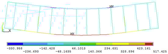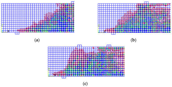 The crack patterns are illustrated in Figure 11 and the gradation of load steps show that the mode of failure is a diagonal tension failure. The green and blue cracks began as vertical cracks (flexural cracks) due to flexural tensile stress and grew both in width and length with the increase of load; then they bent in a diagonal direction as they moved to the upper part of the beam toward the loading point.