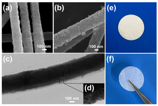 (a,b) SEM images of (a) PAN nanofiber and (b) PAN@PSiO composite nanofiber; (c,d) TEM images of PAN@PSiO composite nanofiber; (e,f) optical photos of PAN@PSiO composite nanofiber membrane (e) before and (f) after immersing in the liquid electrolyte till absorbing saturation.