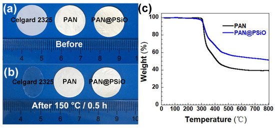 Optical photos of the Celgard 2325, PAN nanofiber membrane and PAN@PSiO nanofiber composite membrane (a) before and (b) after exposure at 150 °C for 0.5 h; (c) TGA curves of PAN and PAN@PSiO membranes.