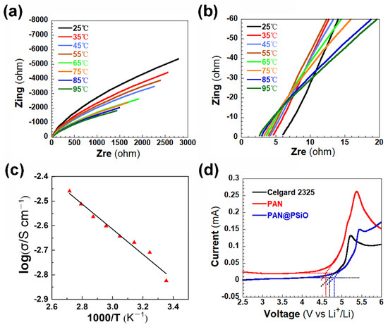 Ionic conductivity is an important index to balance the practicality of the polymer electrolytes and the separators. Therefore, the AC impedance test was carried out to calculate the value of the ionic conductivity of the prepared stainless steel (SS)|PAN@PSiO|SS symmetric cell. The AC impedance spectra and high frequency impedance spectra of the PAN@PSiO membrane at different temperatures are shown in Figure 3a,b, respectively. The intercept of the AC impedance spectra decreases in the high frequency region, and the radian of the spectra increases in the middle and low frequency region with the increase in the temperature, which occurred mainly due to the decrease in the charge transfer impedance and the interfacial impedance with the increase in the reactant activity. Figure 3c is the Arrhenius diagram of the ionic conductivity for the PAN@PSiO electrolyte membrane. With the increase in the temperature, the ionic conductivity of the polymer electrolyte increases continuously from 1.58 × 10−3 S cm−1 at 25 °C to 3.46 × 10−3 S cm−1 at 95 °C, which is due to the accelerated decomposition of the Li salts in the electrolytes and the faster migration of the Li ions as temperature rose. Using the SS sheet as the cathode electrode, the Li metal as the anode, the SS|Clegard2325|Li, SS|PAN|Li, and SS|PAN@PSiO|Li cells were assembled in the glove box that was filled with argon. As Figure 3d shows, the decomposition voltages of Celgard 2325, PAN, and the PAN@PSiO electrolyte membranes at room temperature are 4.6 V, 4.7 V, and 4.8 V, respectively, indicating that the nanofiber membranes possess excellent electrochemical stability.
