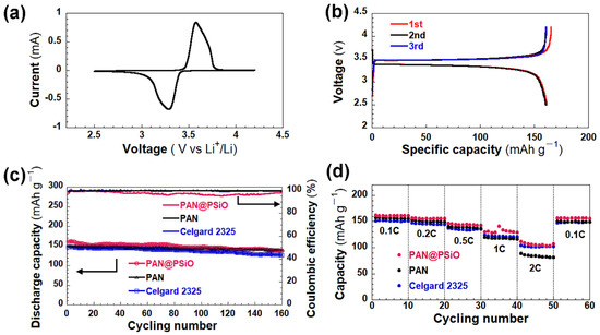 (a) CV curves of the LiFePO4|PAN@PSiO|Li battery between 4.2 and 2.5 V at a scan rate of 0.1 mV s−1; (b) potential–capacity profiles of the LiFePO4|PAN@PSiO|Li battery at 1st, 2nd, and 3rd cycles under 0.1 C at room temperature; (c) cycling performance of the LiFePO4|Celgard 2325|Li, LiFePO4|PAN|Li and LiFePO4|PAN@PSiO|Li batteries at 0.2 C; (d) rate performance of LiFePO4|Celgard|Li, LiFePO4|PAN|Li, and LiFePO4|PAN@PSiO|Li batteries at current densities varied from 0.1 C to 2 C.