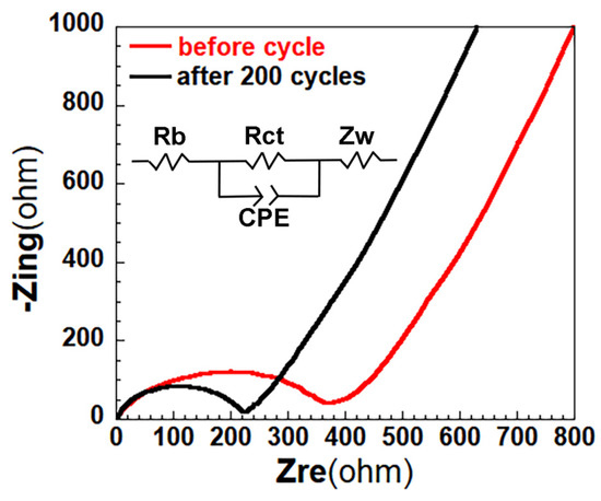 Nyquist plots for the LiFePO4|PAN@PSiO|Li battery acquired in the frequency range of 100 KHz to 10 MHz before and after 200 cycles at the current density of 2 C.