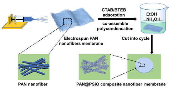 CTAB (200 mg) was dissolved in a mixed solution comprising ethanol (0.03 mL) and deionized water (50 mL). PAN nanofibers (0.05 g) were then immersed into the solution by adding 1 mL of BTEB and 0.6 mL of concentrated ammonia water. The solution was stirred for 12 h at 40 °C to prepare PAN/1,4-phenylene bridged PSiO composite nanofibers membrane (denoted as PAN@PSiO). The preparation process is indicated in Scheme 1.