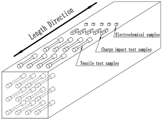 The experimental alloy was melted and poured into 50 kg ingots in a vacuum induction furnace (ZG-100 type, Suzhou Zhenwu Electric Furnace Co., Ltd., Suzhou, China) with the chemical composition of 0.023 ± 0.002 C, 0.46 ± 0.02 Si, 1.19 ± 0.04 Mn, 27.01 ± 0.11 Cr, 6.51 ± 0.08 Ni, 4.54± 0.04 Mo, 0.92 ± 0.04 Cu, 0.99 ± 0.03 Co, 0.42 ± 0.01 N (in wt.%), and Fe balance. The experimental steel ingot was forged into billets of 80 mm in length and 80 mm in width. The cross section of samples was processed to 14 mm × 14 mm. The sampling schematic for the test specimens is shown in Figure 1. In order to study the effect of different solution temperatures on the microstructure evolution, mechanical properties, and corrosion resistance, the specimens were solution-treated at 1040, 1070, 1100, 1130, 1150, 1180, and 1200 °C for 80 min, respectively, and then quenched in water rapidly.