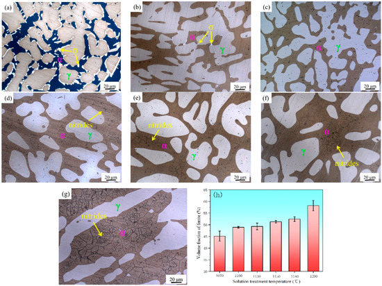 Figure 2 shows the microstructural evolution of the samples with different solution treatment temperatures, in which the island-shaped light white γ phase is distributed in the gray α-phase matrix. Figure 2a shows that a large amount of undissolved σ phase exists at the boundary between the α and γ phase after solution treatment at 1040 °C. There are still small amounts of σ phase at 1070 °C (Figure 2b). When the solution treatment temperature is higher than 1100 °C, the σ phase can be completely eliminated (Figure 2c). The grain size of the ferrite begins to coarsen when the solution treatment temperature is higher than 1130 °C. The proportion of nitrides in the α phase gradually increase (Figure 2d–g). However, there is no secondary-phase precipitation in the γ phase. With the increase in the solution treatment temperature, the volume fraction of the α phase gradually increases, as shown in Figure 2h. A typical diffusion-controlled solid-phase transformation occurs, with a ratio of nearly 50% in the temperature range of 1100 to 1150 °C.
