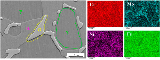 SEM image and EDS elemental distribution assessment of the function of Cr, Mo, Ni, and Fe of each specimen after solution treatment at 1040 °C.
