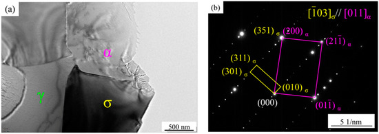 The SEM image and EDS analysis of the sample after solution treatment at 1040 °C are shown in Figure 3. It can be seen that the secondary phase is rich in Cr and Mo elements. The TEM images and electron diffraction (SAED) analysis of the secondary phase with lattice constants a = b = 0.879 nm and c = 0.454 nm (Figure 4), which is identified as σ phase. The orientation relationship between the α and σ phase can be determined as follows: