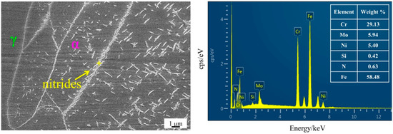 Due to its high strength, stress corrosion resistance, and excellent weldability, super-duplex stainless steel is widely used in the marine industry, petrochemical industry, paper-making industry, and others [1,2,3,4]. In order to cope with severe corrosive working conditions, such as flue gas desulfurization and deepwater oilfield development, 00Cr27Ni7Mo5N HDSS with higher alloy elements came into being. With pitting resistance equivalent values up to 48 or more, it can be used in seawater, high chlorine, and high acid environments for long periods of time [1,4,5]. At the same time, HDSS has excellent mechanical strength, so it can replace the expensive nickel-based alloys. However, the incorporation of a higher content of Cr, Ni, Mo, and nitrogen elements brings excellent strength and corrosion resistance, but increases the risk of precipitation of secondary phases, such as the σ phase in the ternary Fe-Cr-Mo system, χ phase in the quaternary Fe-Cr-Ni-Mo system, and non-equilibrium nitrides [5,6,7,8,9,10,11,12,13,14]. Once precipitated, it can significantly deteriorate the mechanical properties of the alloy as well as the corrosion resistance under harsh conditions [15,16,17].