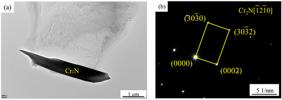 Figure 5 shows the SEM image and EDS analysis of the sample after solution treatment at 1200 °C. A large number of long rod-like secondary phases precipitate, which are concentrated inside the α phase and the grain boundary between the α phase. The EDS analysis shows that it is rich in Cr and nitrogen elements, among which the content of Cr elements is higher than that of the matrix. Figure 6 show the TEM analysis of Cr2N, which is determined as a hexagonal close-packed (hcp) structure. The lattice parameters are a = 0.480 nm and c = 0.447 nm. Liang et al. [14] found the presence of nanorod chromium nitride precipitation on lamellar carbides along the α- and γ-phase boundary in UNS S32760 super-duplex stainless steel. Shi et al. [18] reported that Cr2N showed granular and lamellar morphology, while Zhang et al. [19] reported that the shape of Cr2N was speckled. This work shows that the Cr2N precipitated in HDSS exhibits long rod-like structures. With the increase in the solution treatment temperature, the solid solubility of nitrogen elements in the α phase increases rapidly, and a large number of nitrogen atoms migrate to the α phase, which cannot be diffused in time during the water-cooling process, so they are dispersed and precipitated in situ in the α phase [19,26]. Deng et al. [27] indicated that non-equilibrium nitrides can only precipitate within the α phase in UNS S32750 super-duplex stainless steel when the solution treatment temperature is higher than 1200 °C. In this work, the content of the nitrogen element in HDSS is as high as 0.43 wt.%. These kinds of nitrides are precipitated in the α phase after solution treatment at 1130 °C, which reveals that the increase in the nitrogen content significantly promotes the precipitation of non-equilibrium nitrides.