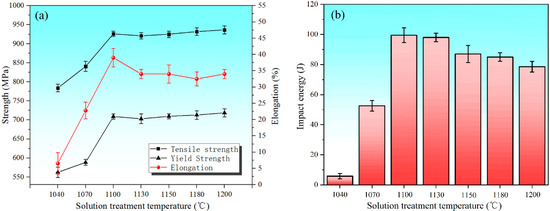 Figure 7 shows the tensile strength and impact test results of samples with different solution treatment temperatures. It can be seen from Figure 7a that the tensile strength and plasticity of the specimens is extremely low after solution treatment at 1040 °C, where the elongation is 7 ± 3% and the impact toughness is 6 ± 2 J. With the increase in the solution treatment temperature up to 1100 °C, the mechanical properties are substantially improved, in which the elongation and impact toughness is 39 ± 3% and 100 ± 5 J, respectively. When the solution treatment temperature is higher than 1100 °C, the yield strength and tensile strength increase slightly, but the elongation decreases. Meanwhile, Figure 7b shows that the impact toughness of the specimens increases first and then decreases with the increase in the solution treatment temperature.
