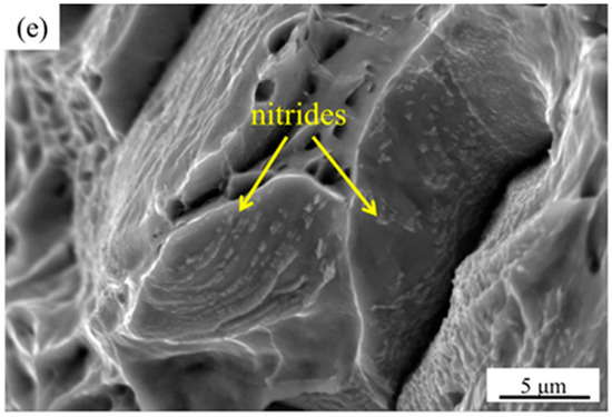 The SEM images of tensile fracture at typical solution treatment temperatures are shown in Figure 8. It can be seen from Figure 8a,b that the tensile fracture of the sample is mainly a mixture of cleavage fracture and fine dimples after the solution treatment at 1040 °C, which is basically brittle fractures. A large amount of massive σ phase exists on the fracture and tear marks (Figure 8b). Figure 8c shows that the tensile fracture of the sample presents a ductile fracture with a large number of deep dimples after solution treatment at 1100 °C. The tensile fracture equiaxed dimples gradually decrease, and a large number of micron-level nitrides attach to the fracture at 1200 °C (Figure 8d,e).