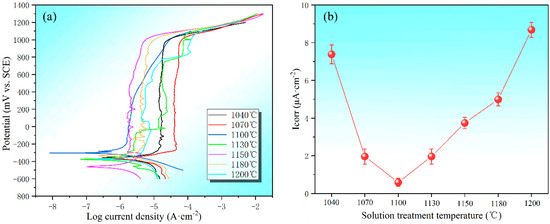 Potentiodynamic anodic polarization curves (a) and corrosion current densities (b) of the specimens after solution treatment at different temperatures.