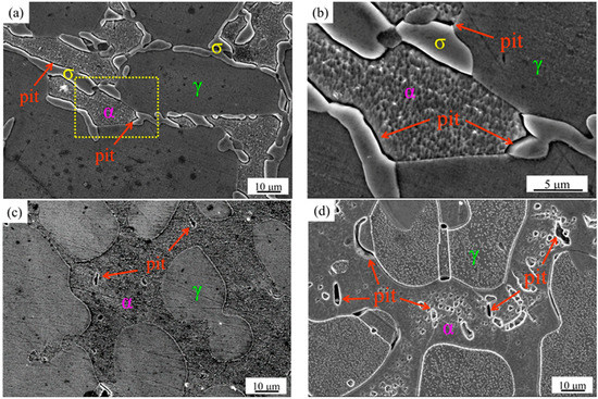 In order to further investigate the corrosion mechanism at different solution treatment temperatures, SEM images of pitting corrosion were obtained (Figure 11). Figure 11a,b show the pitting corrosion morphology of the sample after solution treatment at 1040 °C. It can be observed that there are pits around the σ phase, which precipitates at the interface of the α and γ phase. With the increase in the solution treatment temperature up to 1100 °C, only α and γ phase are presented in the microstructure, which exhibits a few small-sized pits (Figure 11c). Figure 11d shows a significant increase in the number and size of the pits in the α phase of the specimen after solution treatment at 1200 °C. The shape of the pits also basically matches the long rod-like Cr2N morphology. In general, the trend change of the Icorr values is consistent with that of the pits.