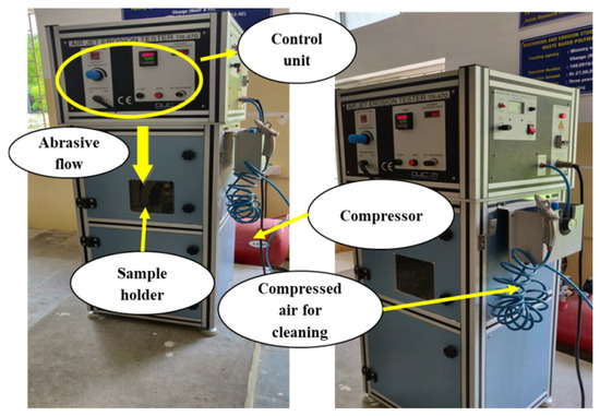 The ASTM G76-13 solid particle erosion test has been carried out by utilising an air jet erosion tester (TR 470 of DUCOM, Bengaluru, Karnataka, India). The air jet erosion tester is made up of the following components: an air compressor, a feeder unit, a mixing chamber, a control unit, an erosion unit, and a dust collector. The erodent was alumina, irregular in shape, with an average size of 50 micron, and it was stored in the hopper as well as transported to the mixing chamber by the conveyor belt unit. The erodent was mixed with dry, compressed, high-speed air of 0.2–5 bar in the mixing chamber. After mixing, the air–erodent combination was pushed via the erosion unit’s tungsten carbide nozzle (1.5 mm diameter, 50 mm length) and the specimen was struck at high velocity. The sample was made to be 25 × 25 × 5 mm in size for the air jet erosion experiment. The experiment has been carried out with a continuous erosion time of 10 min and a standoff distance of 10mm. Each specimen was cleaned and weighted using a precision balance with 0.1 mg accuracy before and after the erosion test. Each experiment was performed three times, and the average weight loss was measured, then the erosion rate of each sample was computed using the weight loss. The erosion rate is the amount of material lost from the composite per unit time by the impact of the erodent released, and it may be computed using Equation (1) [26]:
