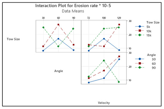 The erosion testing parameters and the material qualities had an impact on the solid particle erosion test. The solid particle erosion test on polymer composites heavily influenced the erosion test parameters, such as the impingement angle, erodent velocity, and erodent flow rate. The proper selection of these variables decides the performance, such as lower erosion rate and surface roughness. Figure 3 presents the interaction plot of the erosion rate of the chosen input parameters. The erosion rate decreased with the increased impact angle. It is generally known that for ductile materials, erosion occurs at lower impact angles, whereas for brittle materials, erosion occurs above 90° impact angles [14]. In this research work, the maximum erosion occurred on the fibres at 60°, velocity of 129 m/s, and a 10k tow size. The reason for the changes in the erosion rate of the composite material is the conversion of material to that of a semi-ductile nature. Similar results were observed by the researchers [29,30].