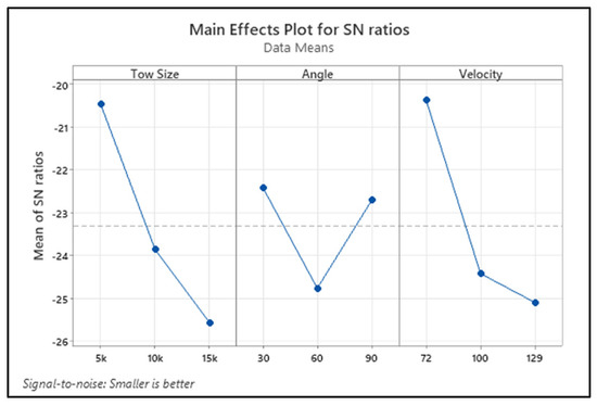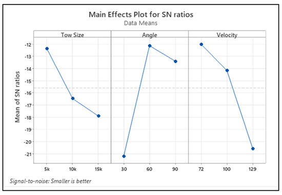 Figure 6 depicts the changes in roughness measured on the eroded samples with input process variables in terms of the S/N ratio and the mean of the response characteristic. It is understood from Table 7 that the delta value of the factor angle was higher than for the other two parameters. This implies the significant influence of the angle on the variation of roughness, followed by velocity and tow size.