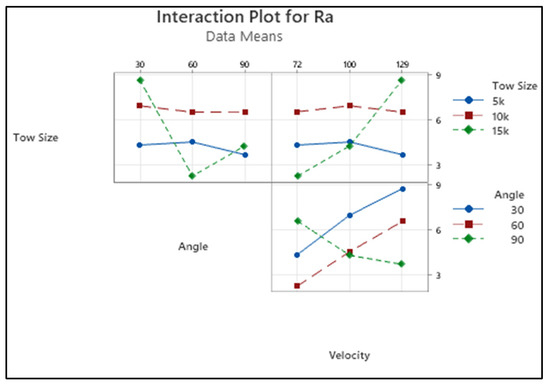Figure 5 shows the interaction plot of surface roughness for varying process parameters. The Ra value measured on the composite material tended to increase when the tow size increased from 5k to 10k. Again, a decrement was noticed for the change in tow size from 10k to 15k. This was caused by the effective package of fibre in the matrix, and it led to protecting the impact impinged by the solid particle. A decrement was observed while increasing the impact angle from 30 to 90 degrees.