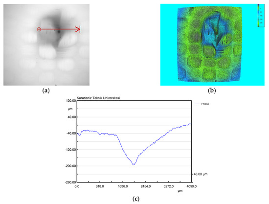 Surface of the eroded sample (Tow = 10k, Angle = 90 degrees, Velocity = 129 m/s), surface topography: (a) microscopic view, (b) 3D surface profilometer image, and (c) surface profile.