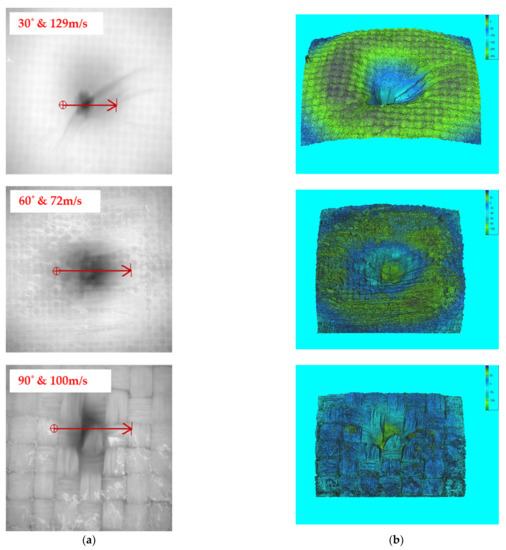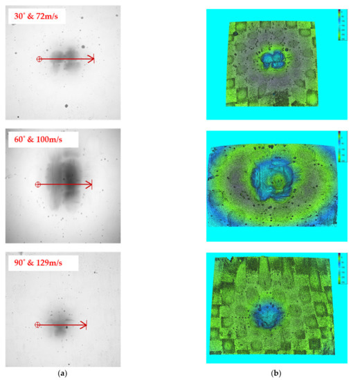 The impact of hard particles on the surface in the perpendicular direction broke the fibre and formed the waviness [31]. When the composite surface was placed at a certain angle and the impact was at an inclined degree, the area on which the impact was caused was wider and deeper, and it resulted in the formation of craters on the composite materials. Sometimes, it also led to the formation of craters in the poor-quality region. Ultimately, the impact at certain angles damaged the surfaces and broke the fibres, as well as formed wider and deeper impacts with increased roughness.