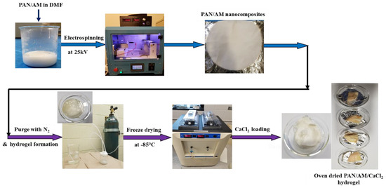The PAN and AM nanocomposite structures were fabricated using the electro-spinning technique under various voltages, collector distances, and pump speeds. The required amount (2 g of PAN and 2 g AM) of PAN and AM was dissolved in DMF (16 g by weight) and stirred at 40 °C for 4 h. The ratio of PAN and AM is 50:50. This ratio is optimized by several trials and the nanocomposites were successfully synthesized. If the quantity of AM was increased, then a thick viscous blend is formed, that is not spinnable. The solvent and polymer ratio was 80:20. The prepared solution was electro-spun and dried for 24 h in an open atmosphere. Then, the PAN/AM nanostructured materials were submerged in water (25 mL). The dispersion was purged with nitrogen for 1 h to eliminate any dissolved oxygen. Now, 0.4 g of KPS as initiator and 0.1 g of MBAA as a crosslinking agent were then added to the dispersion. Finally, 600 μL of TEMED solution was added as the cross-linking accelerator. The PAN/AM hydrogel was obtained after the mixture was settled overnight. The hydrogel was fabricated with/without MWCNTs and graphene incorporation. The as-prepared PAM/AM hydrogel was freeze-dried at −80 °C for 24 h. Then, 30 mL of CaCl2 solution with varying concentrations (0.2, 0.4, 0.6, 0.8 g/mL) was prepared and freeze-dried hydrogel was immersed in the CaCl2 solution for 24 h under ambient conditions. The as-prepared PAN/AM/CaCl2 hydrogel was dried at 80 °C in an oven for 3 days. The step-by-step PAN/AM/CaCl2 hydrogel fabrication process is presented in Figure 2. To incorporate the photothermal nanomaterials such as MWCNTs and graphene into the hydrogel, the PAN/AM nanostructured materials were submerged in a dispersion containing a specified amount of MWCNTs and graphene. In the present work, the MWCNTs and graphene loading in the hydrogel were set to 0.45 wt%. It was observed that a small amount of photothermal nanomaterials in the hydrogel would lead to a large increase in light absorbance [31].
