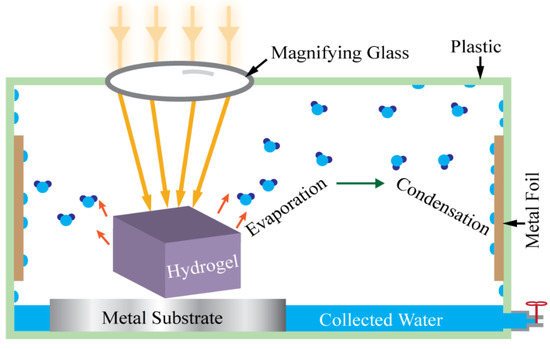 This atmospheric water vapor collection device consists of a plastic box, copper foil, aluminum foil, a transparent cap, and a commercial magnifying glass. The magnifying glass was used to concentrate the incoming sunlight, the aluminum foil was used as an isolator, and the copper foil was used as the heat-conductive sidewall. The copper foil has high thermal conductivity and therefore is beneficial to condense water on this wall plate surface where ambient air works as the heat sink. The temperature gradient between the cold copper surface of the container wall and the warm hydrogel regulates the water condensation process. When hydrogel is heated by the concentrated incoming sunlight, it produces water vapor with high partial pressure in the air inside the container, which is higher than the saturated vapor pressure of water. This water vapor meets the cold wall, condenses on its surface, and produces water.