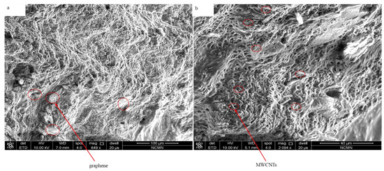 SEM images of hybrid hydrogel: (a) PAN/AM/graphene/CaCl2, and (b) PAN/AM/MWCNTs/CaCl2.