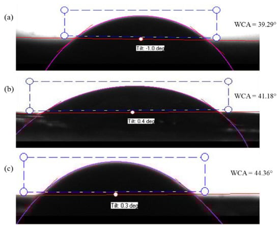 The hydrophobicity and hydrophilicity of a solid surface are mainly determined by the water contact angle (WCA) measurement. It is based on the observation of the intermolecular interactions between the surface and a small drop of water when the drop meets the surface. A contact angle larger than 90° indicates that the surface is hydrophobic. When the water contact angle is less than 90°, the surface is hydrophilic hence, the surface is wettable. Goniometer tests showed that the average water contact angle of the PAN/AM/CaCl2; PAN/AM/graphene/CaCl2 and PAN/AM/MWCNTs/CaCl2 hybrid hydrogel was 39 ± 2.1°, 41 ± 1.3° and 45 ± 1.8°, respectively. So, they are highly hydrophilic samples for better moisture absorption. Figure 6 shows the water contact angle of (a) PAN/AM/CaCl2; (b) PAN/AM/ graphene /CaCl2 and (c) PAN/AM/ MWCNTs/CaCl2 hybrid hydrogel.