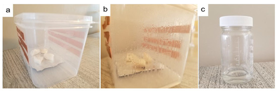 Digital photos of water collection: (a) homemade water collection device prototype based on PAN/AM/CaCl2 hydrogel; (b) condensed water on the wall of the box during the water collection process; and (c) water collected from a plastic box.