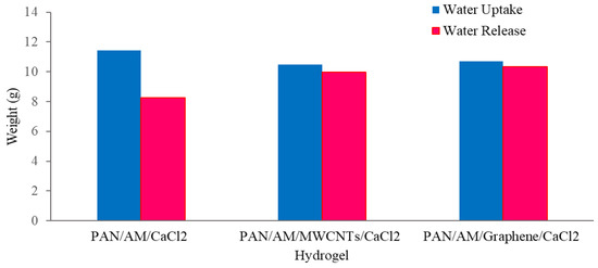 The dry PAN/AM/CaCl2 hydrogel with a weight of 10 g was placed in the device, and the device was then placed outdoors overnight in Wichita, Kansas, USA, from 7 pm, 25 July 2020, to 7 am 26 July 2020. The average temperature and relative humidity values were 30 °C and 60%, respectively. The solar irradiation intensity of natural light was 6.21 kWh/m2/day and the hydrogel sorbed 11.6 g of water during a 12-h period. The water release and collection were conducted under natural sunlight without any concentration. This experiment was performed during 12:45–3:15 p.m., local time on 26 July 2020. Within this 2.5-h period, around 6.66 g of freshwater was collected inside the collection device. The reason that only 6.66 g of the 11.6 g of water was collected can be explained as follows: (a) a significant number of water droplets were sticking to the container walls, and (b) the water-releasing performance in the sealed chamber was lower because of the much higher water vapor partial pressure inside the sealed container. To further enhance the performance of the hydrogel, MWCNTs and graphene were incorporated into the hydrogel. Both were used as photothermal components because of their mechanical and chemical stability, superior light absorbance, outstanding light-to-heat conversion efficiency, and ability to localize thermal energy at the water-air interface, as reported in the literature [40,41]. In this study, the PAN/AM/MWCNTs/CaCl2 hydrogel and the PAN/AM/graphene/CaCl2 hydrogel were synthesized using in situ polymerization of electrosprayed PAN/AM nanostructures in the presence of MWCNTs and graphene. The main reason for adding MWCNTs and graphene to the hydrogel was to increase the light absorption capability. The water vapor sorption and water release experiments of the PAN/AM/MWCNTs/CaCl2 hydrogel and the PAN/AM/graphene/CaCl2 hydrogel were conducted on the same day as the experiment for the PAN/AM//CaCl2 hydrogel. Around 10 g of dried PAN/AM/MWCNTs/CaCl2 was placed in the collection device and then left outdoors overnight. The hydrogel sorbed 10.66 g of water during the 12-h period. The amount of sorbed water was slightly decreased due to the MWCNTs loading. The hydrogel is a porous structure and due to the geometry of nanoparticles, the addition of MWCNTs reduces the sorption kinetics. The water release and collection were conducted under natural sunlight. Within only a 2.5-h period, around 8.35 g of freshwater was collected inside the collection device. This can be attributed to the higher light absorbance and outstanding light-to-heat conversion efficiency of MWCNTs. The greater performance of the water release of the hydrogel can be attributed to the porous structure of the electrospun PAN/AM hydrogel, which is an effective strategy to increase the light absorption of carbon-based nanomaterials. However, the evaporate gas condensation ability and the droplet behavior greatly influence the water collection efficiency. Several studies investigated the effect of the thermal conductivity of the substrate materials on the fig collection efficiency [42]. Figure 8 illustrates the water uptake and release by the different types of hybrid hydrogel without using a magnifying glass. In a similar study, Li et al. fabricated a PAM/MWCNTs/CaCl2 hydrogel, and 35 g of this dry hydrogel was tested outdoors under field conditions, delivering 20 g of freshwater within 2.5 h under natural sunlight. [43] However, water uptake and release for the graphene-incorporated hydrogel were 10.79 g and 8.85 g, respectively, for 10 g of dried PAN/AM/graphene/CaCl2 hydrogel for the same duration of water uptake and release. A magnifying glass was used in the homemade collection device to enhance further water release from the hydrogel. Figure 9 shows the performance of the water release using a magnifying glass. With the magnifying glass, the water release rate was substantially increased for all hybrid hydrogels studied here.