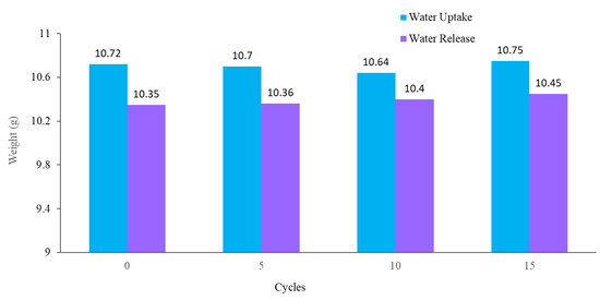 The stability and reusability of the fabricated hybrid hydrogel were studied using multi-cycle water vapor harvesting tests. One cycle of water collection included 12 h of the water uptake and 2.5 h of the water release process using the previously mentioned method, followed by air-drying, and drying in an oven for 30 min at 60 °C. The water vapor collection performance of the hydrogel was recorded after 5, 10, and 15 cycles. Figure 11 shows the water collection of the PAN/AM/graphene/CaCl2 hydrogel for different water collection cycles (with magnifying glass). As can be seen, there was no obvious impairment in the water collection performance, even after 15 cycles of repetitive water collection. Like PAN/AM/graphene/CaCl2 hydrogel, the water vapor collection of PAN/AM/MWCNTS/CaCl2 hydrogel was also studied. Table 1 summarizes the water collection performance of PAN/AM/MWCNTS/CaCl2 hydrogel multi-cycle water vapor harvesting tests. Even after 15 cycles of repetitive water collection cycles, the hydrogel exhibits a stable water collection performance. This can be attributed to the structural rigidity of the hydrogel and the retainability of the CaCl2 salt in the hydrogel network. Even after 15 cycles, a stable water uptake and release performance was observed.