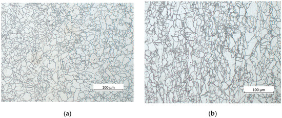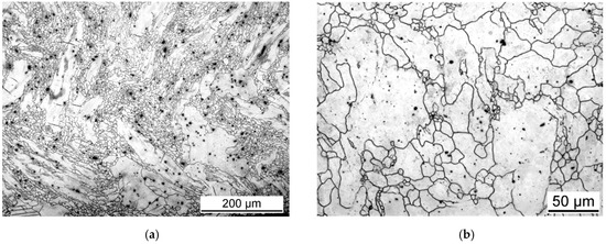 Light micrographs of the processed material, after quintuple swaging steps, are shown in Figure 4a from the section perpendicular to the extrusion direction, and in Figure 4b from the section parallel to the extrusion direction. It is obvious that the grain structure became homogeneous and the grain size became smaller. The average grain size of the swaged sample was calculated in the previous study to be ~16 μm [31,32]. Note that the presence of large non-recrystallised grains observed in the as-extruded state was completely suppressed by the rotary swaging process.