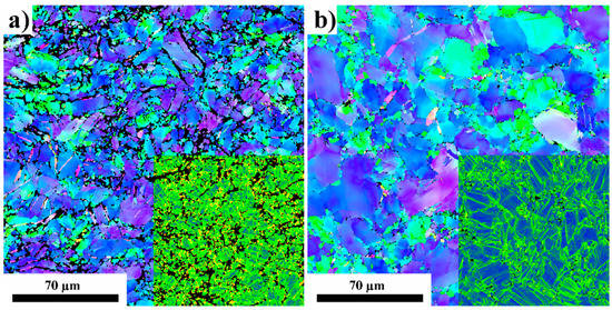 EBSD orientation maps of swaged (a) and swaged + aged (b) samples. Overlay of kernel average misorientation maps is presented in the bottom right corner of each orientation map (colour scale blue-green-red).
