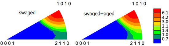The inverse pole figure (IPF), calculated for the section perpendicular to the extrusion direction, is shown for the swaged and aged samples in Figure 10. The swaged sample exhibits a strong fibre texture, which is typical for the extruded and swaged magnesium alloys due to axially symmetric radial compression deformation. The data unambiguously showed that the ageing process did not cause any major change in the crystallographic texture of the investigated material.