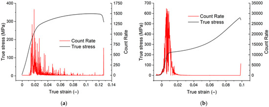 Tensile and compression deformation curves are shown in Figure 11a,b. The characteristic stresses and the total strain are reported in Table 1. For comparison, the values found for the original extruded material are given in Table 1. During deformation, acoustic emission was recorded. It is obvious that the acoustic emission signal is much stronger in compression.