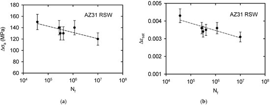As mentioned above, the samples were cyclically loaded in the push–pull regime under a sinusoidal stress cycle. The stress amplitude was reduced stepwise from 150 MPa to 120 MPa. Samples loaded with an amplitude of 120 MPa were not broken even at the limit number of cycles 107. This amplitude may be considered as the fatigue limit. Figure 12a shows the variation of the stress amplitude Δs, as well as the number of cycles to failure, Nf, on the semi-logarithmic scale. Similarly, the dependence of the saturated strain amplitude on the number of cycles, Nf, is shown in Figure 12b.